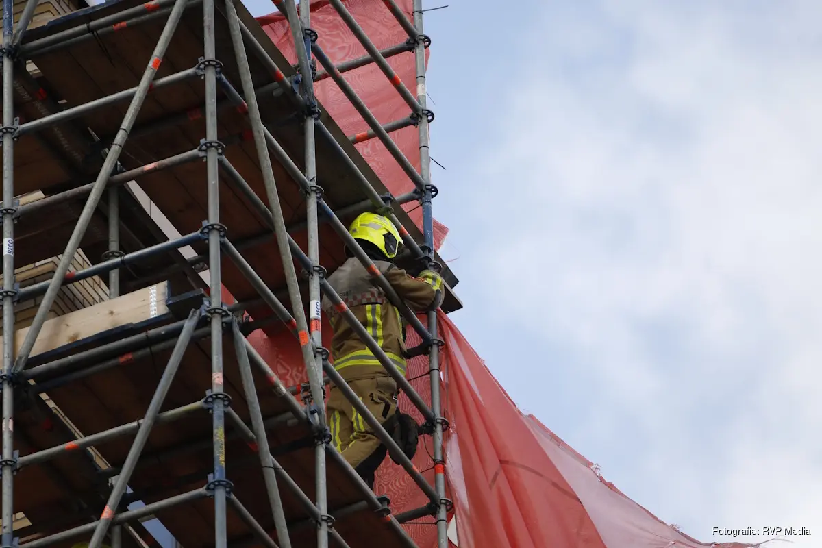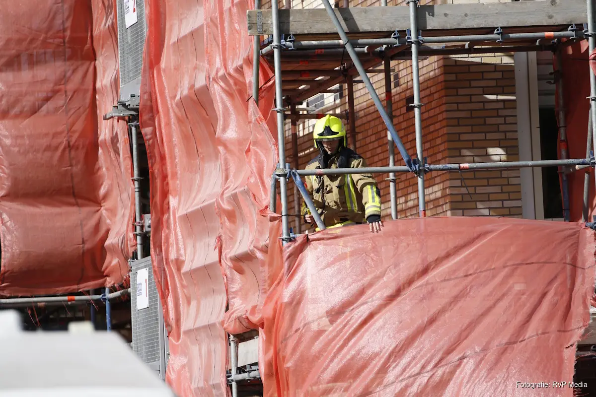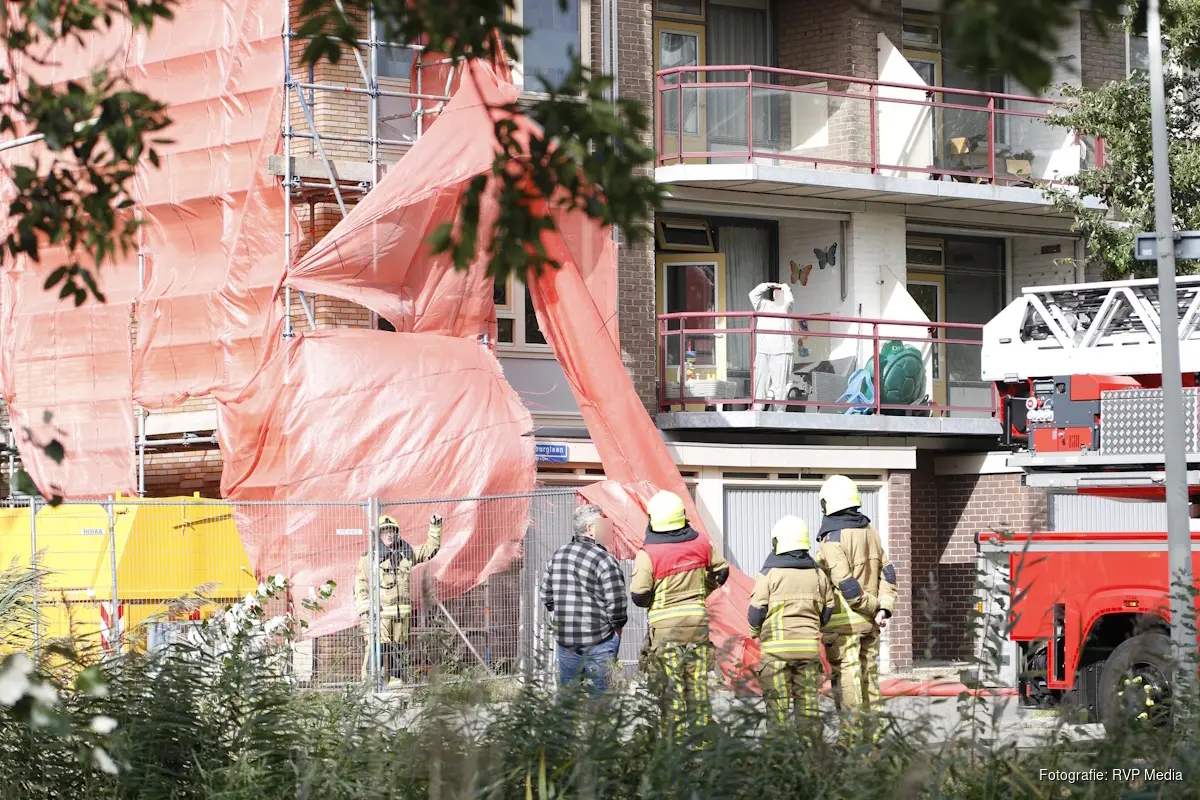 Bij aankomst van de brandweer bleek er een doek van een steiger los te zijn gekomen. Het doek beschermt normaal gesproken de medewerkers welke aan het werk zijn op de steiger.