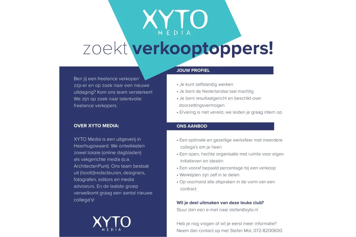 XYTO Media is een uitgeverij in Heerhugowaard. We ontwikkelen zowel lokale (online dagbladen) als vakgerichte media (o.a. ArchitectenPunt). Ons team bestaat uit (hoofd)redacteuren, designers, fotografen, editors en media adviseurs. En de laatste groep verwelkomt graag een aantal nieuwe collega’s!
